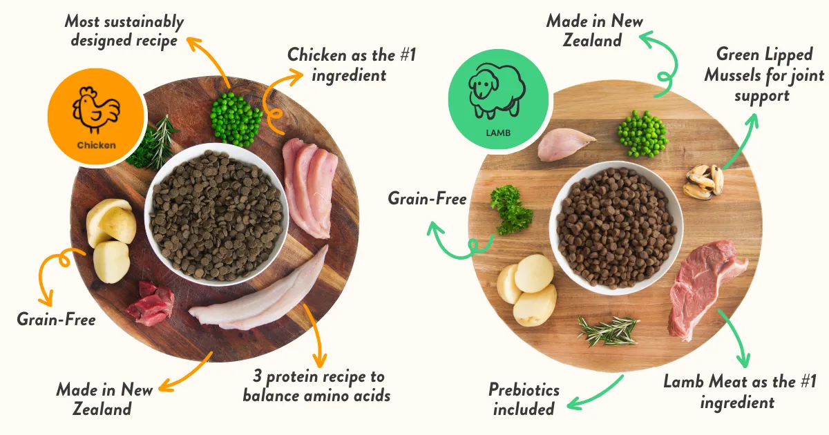Chicken is the number 1 ingredient. Wild caught NZ fish and grass fed NZ beef help provide all the essential amino acids a thriving dog needs.